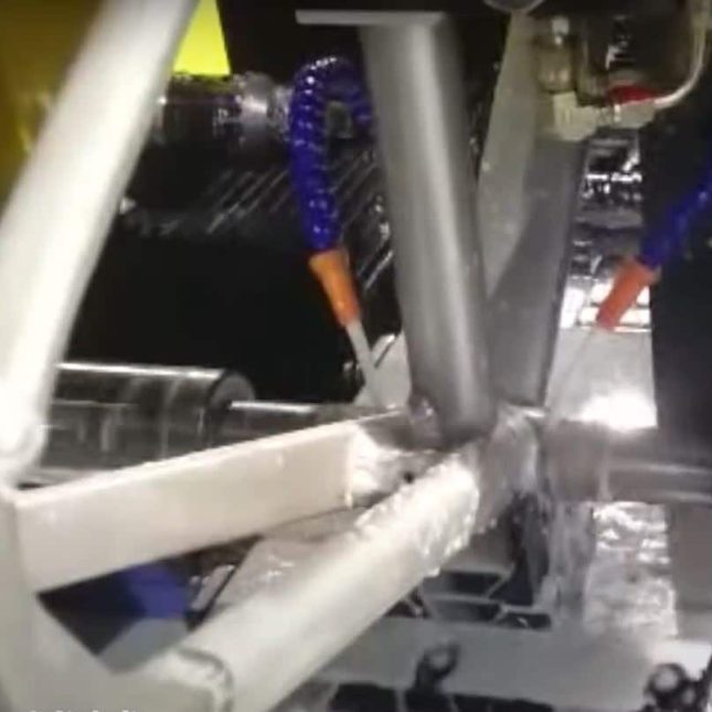 經過沖弧、銑弧、焊接等過程後,將車架放入,進行立管絞孔。