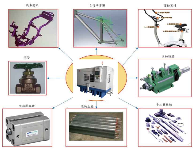 範圍包含機車及自行車龍頭、運動器材、衛浴閥門、機器主軸、空油壓缸體、滾輪及手工具轉軸等。